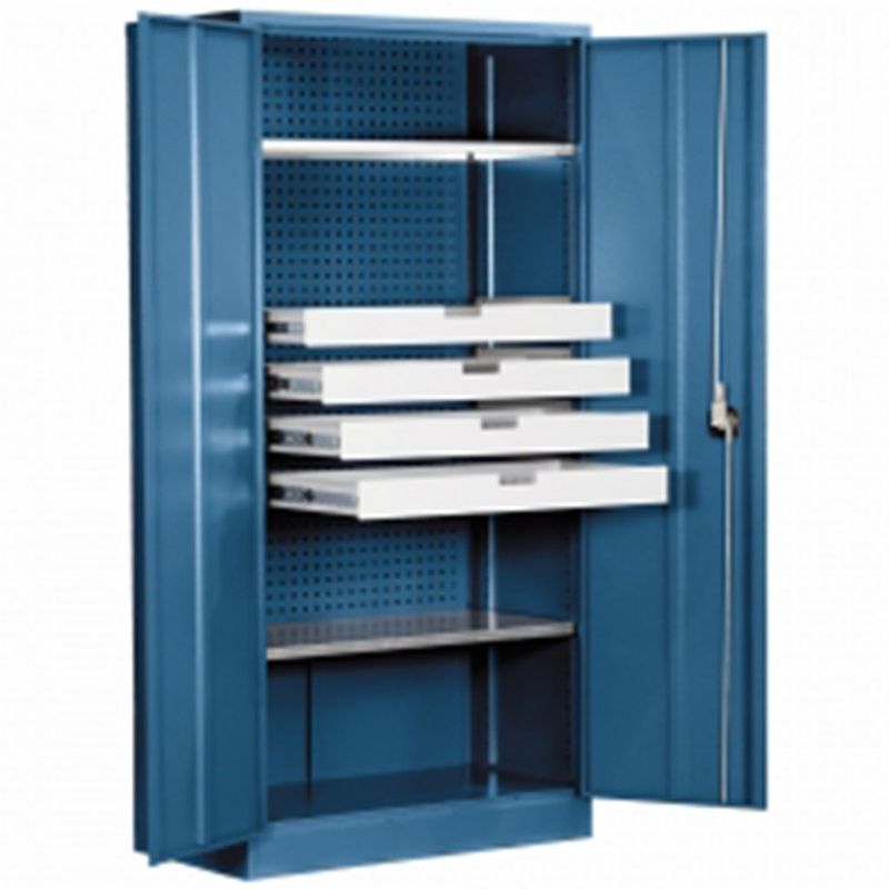 O Armário Universal Jumbo 52640 GEDORE é grande e espaçoso, com 2 prateleiras ajustáveis, 4 gavetas com rolamentos, também de altura ajustável e uma capacidade de até 25 kg por gaveta. Prático para guardar ferramentas de todos os tipos.